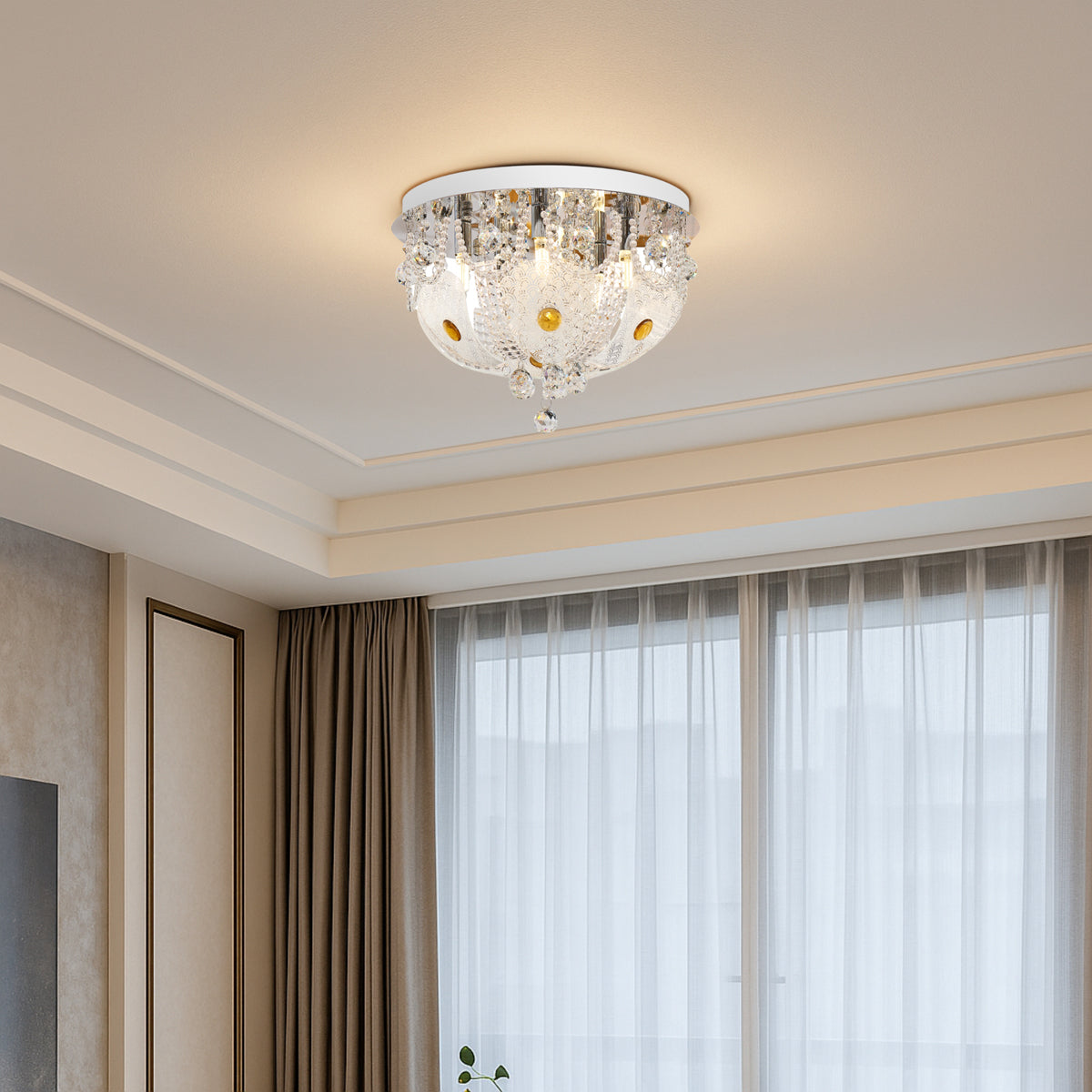 The ELENZA is a classic, extravagant close to ceiling fixture. Glass leaves are hand screen printed and beaded with amber jubes and draped with clear optic crystal shapes. The stainless steel ceiling plate reflects the light source to provide a spectacular lighting effect. Available in 2 sizes.
