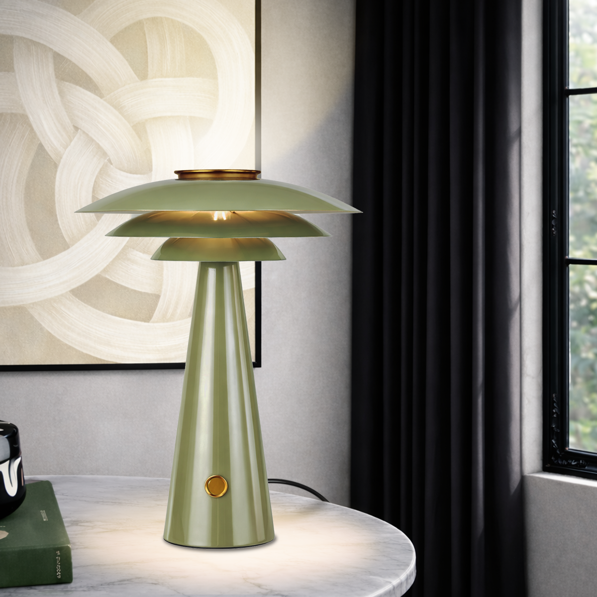The Halvik table lamp showcases a modern, sculptural design with its tiered dome shade and tapered base, crafted entirely from iron for a sleek, durable finish. Available in green or beige, it features subtle gold accents that add a refined, contemporary touch. A built‑in dim switch on the base provides TRIAC dimming, allowing you to effortlessly adjust the ambience from soft mood lighting to brighter task illumination. Perfect for bedside tables, living room side tables, or study nooks, the Halvik brings both style and functionality, enhancing any space with its warm, diffused glow and clean, Scandinavian‑inspired aesthetic.
