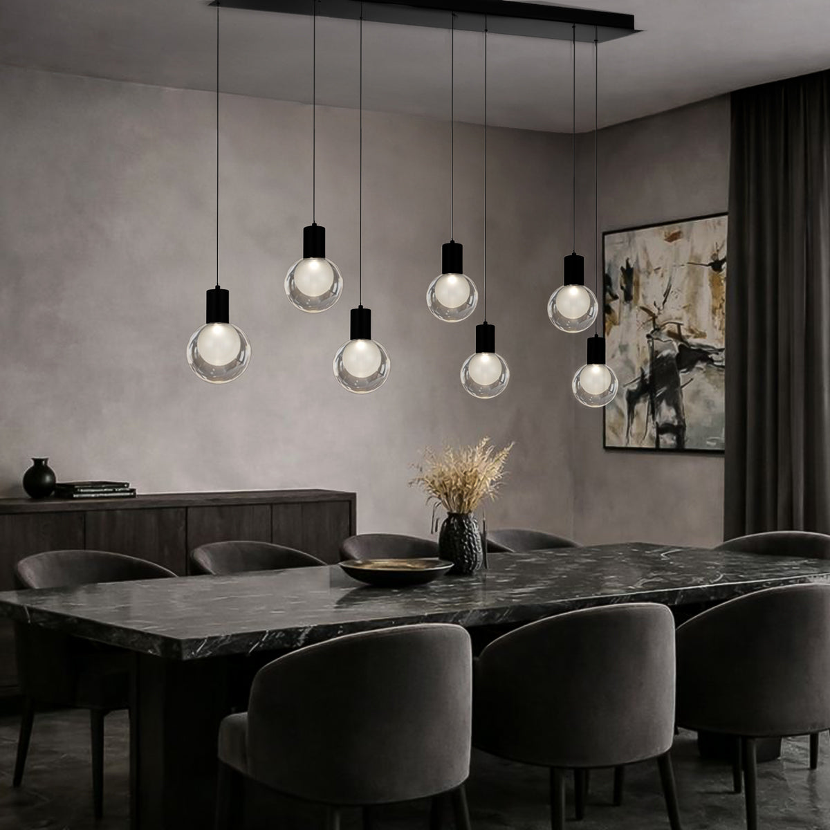 The Invar collection features a sleek series of modern pendant and ceiling lights defined by minimalist forms, clean lines, and exposed-bulb aesthetics. With black and nickel accents and simple suspended sockets, the style leans firmly into modern and contemporary design, making it an excellent fit for kitchens, dining areas, living spaces, lofts, cafés, and other interiors that favour a clean, architectural look.