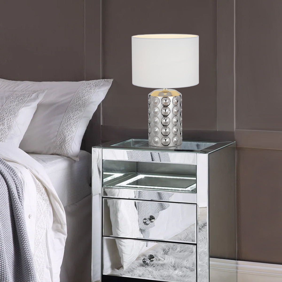 Add glam to your home, with this contemporary ceramic table lamp. Faceted emblems line up symmetrically, and coated in a chrome glaze metal finish. Topped in a classic, white polyester and cotton drum shade.