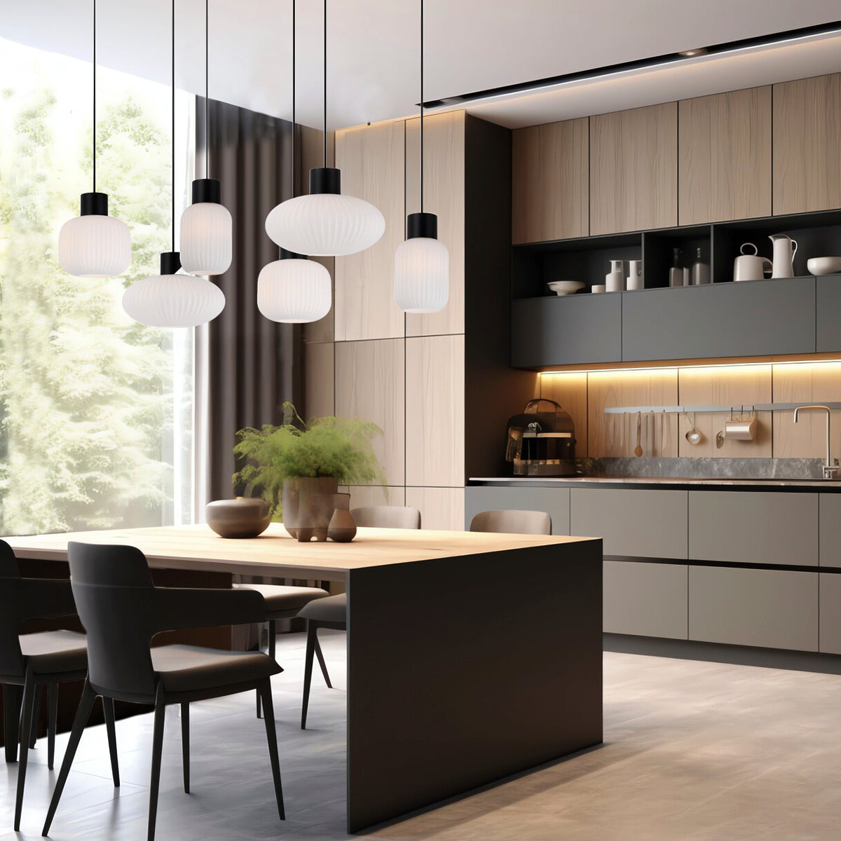 The Nori family is inspired by the traditional lanterns and now on offer with a modernist interpretation. Three unique mouth-blown glass shapes are patterned with a soft ribbed surface that provides a subtle atmospheric light. The glass is offered in opal matt, the metalware is a rich satin black, while the pendants are suspended with textile cable. Available as single and multi-light pendants and as a floor and table lamp.