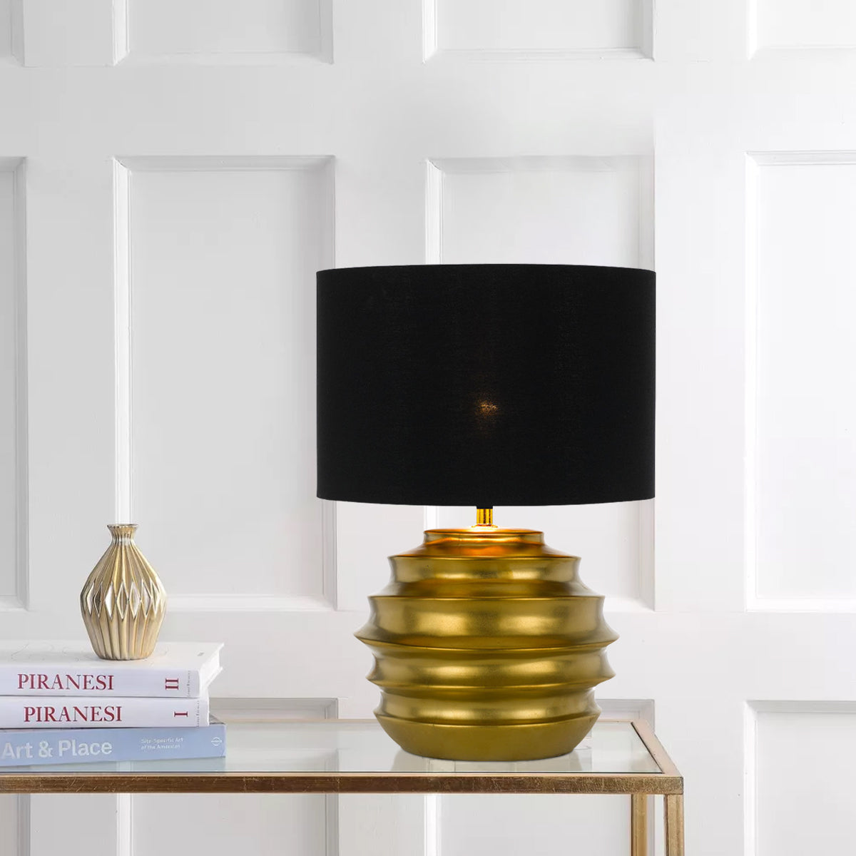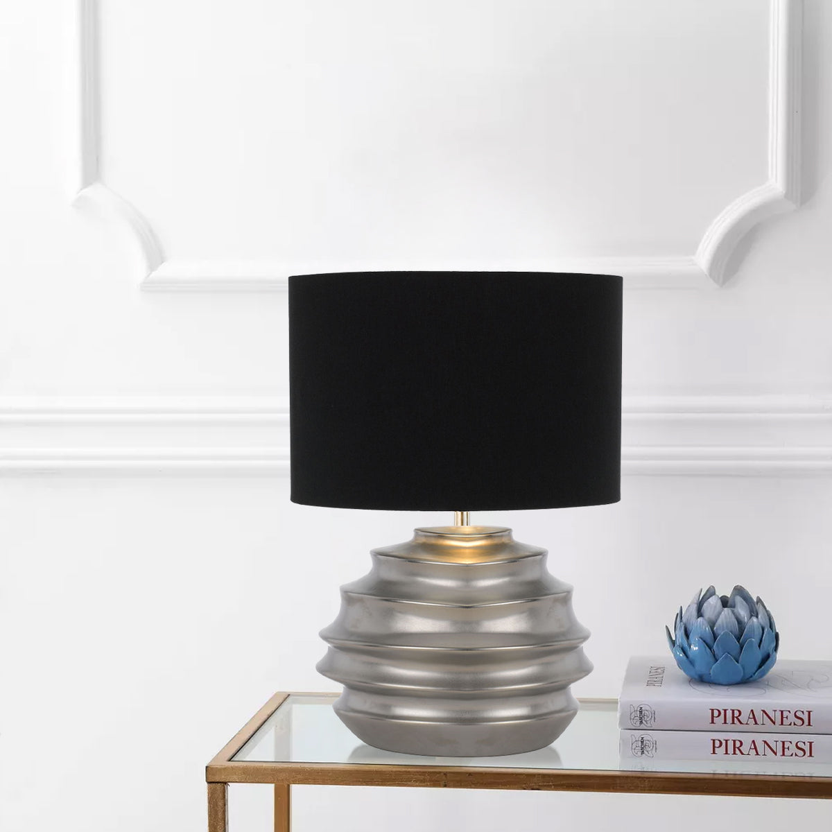 Add a stylish accent to your living table with the beautiful Aras table lamp. The eye catching hive shaped base is finished in gold or silver and topped with a fabric shade which is lined with the base colour.