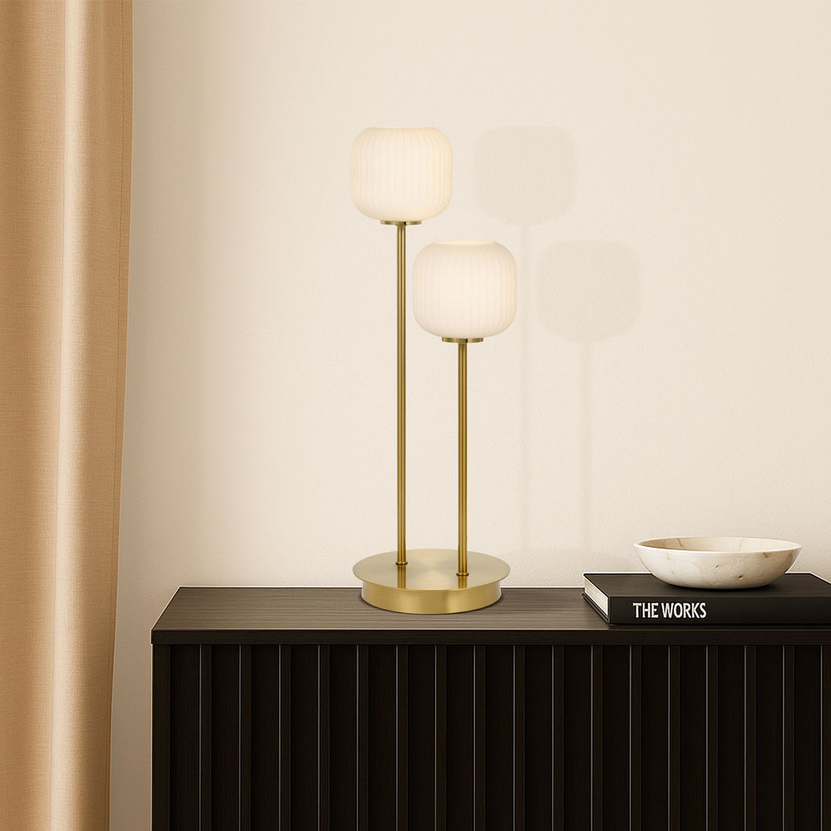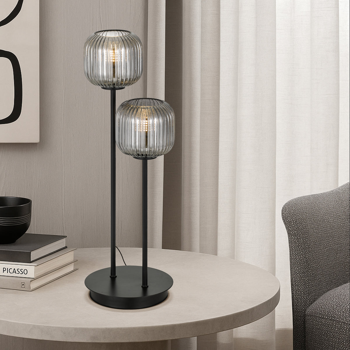 This early century ribbed barrel glass gives a minimalist allure and sleek style for any space in your home. The BOBO collection is best illuminated with a LED twinkle globe accentuating the ribbed surface of the shade. The family includes a 1 light pendant, 1 light wall lamp, 1 light table lamp,2 light table lamp, 4 light bar pendant, 5 light round pendant and 10 light round pendant. Available in Antique gold with opal matt shade or black with smoke.