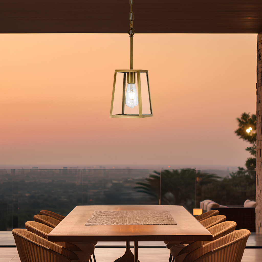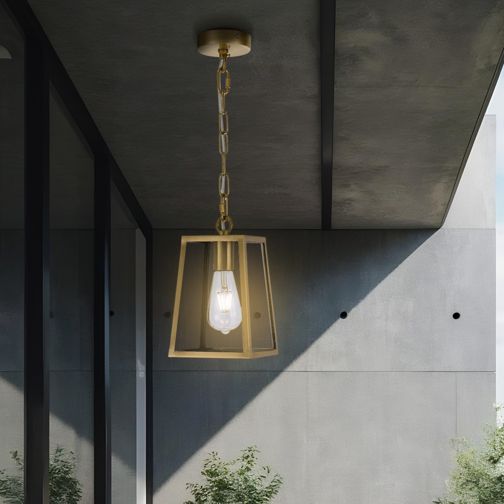 Cantena is a bold yet simple vintage outdoor pendant lamp. The tapered frame holds trapezoid clear glass and is suspended by a short rod with chain. The Cantena family is crafted in solid brass and finished in polished brass or brass painted in black. Available in 2 sizes, also as a wall lamp.