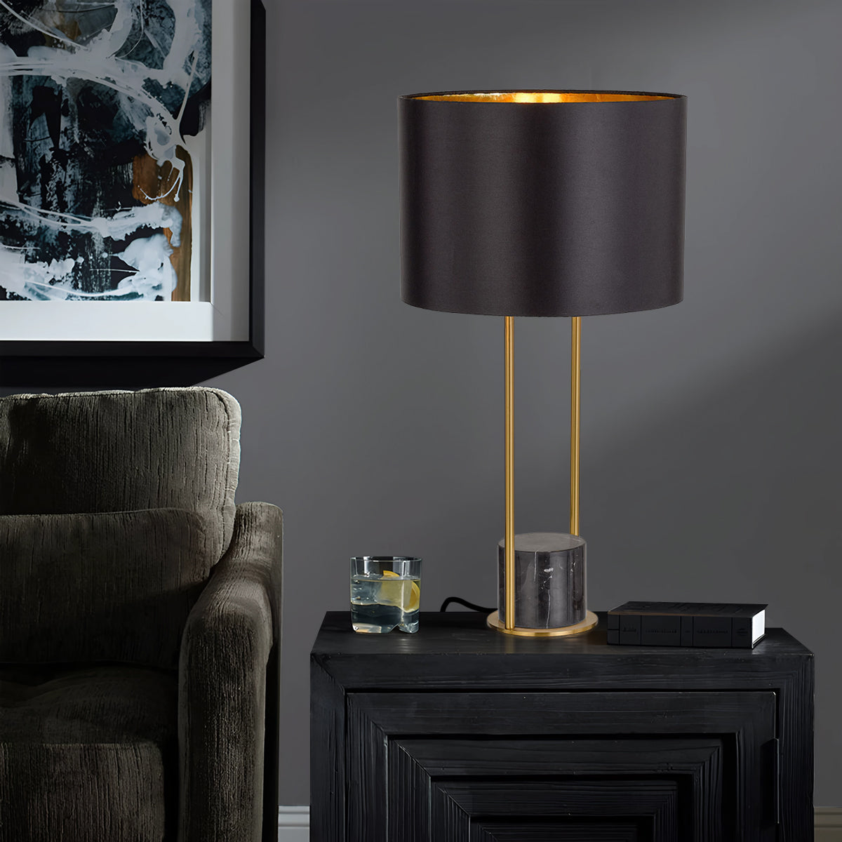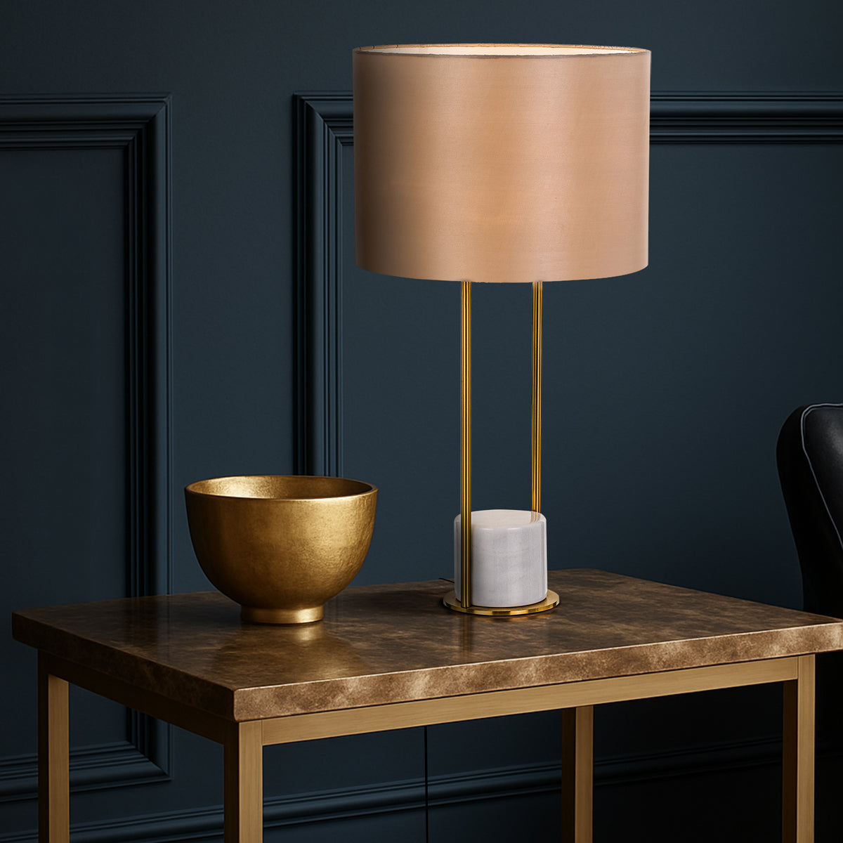 The Desire table lamp is a striking focal point of simple design. A luxury marble base is flanked by an antique gold frame supporting a fabric drum shade. Available in Black or White marble.