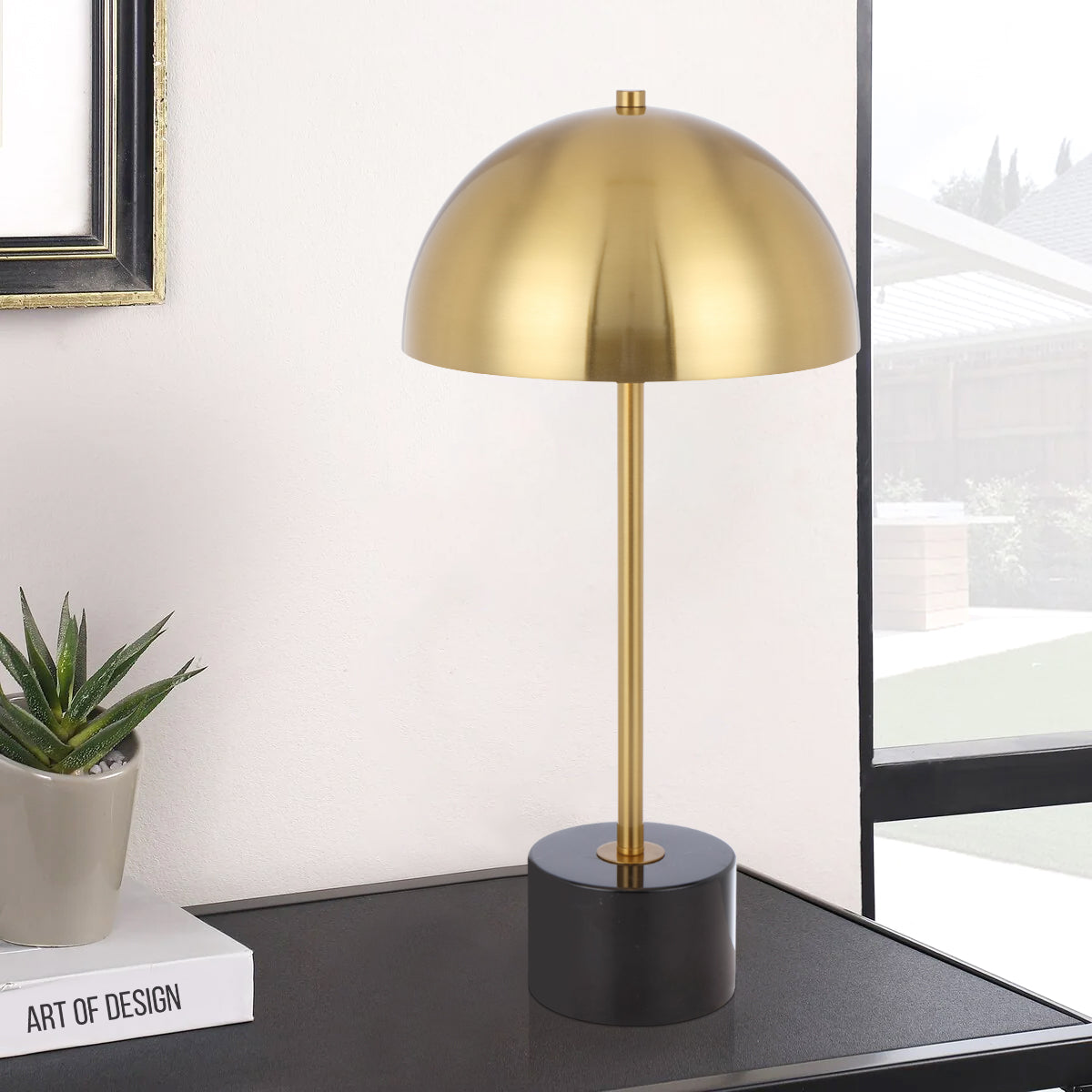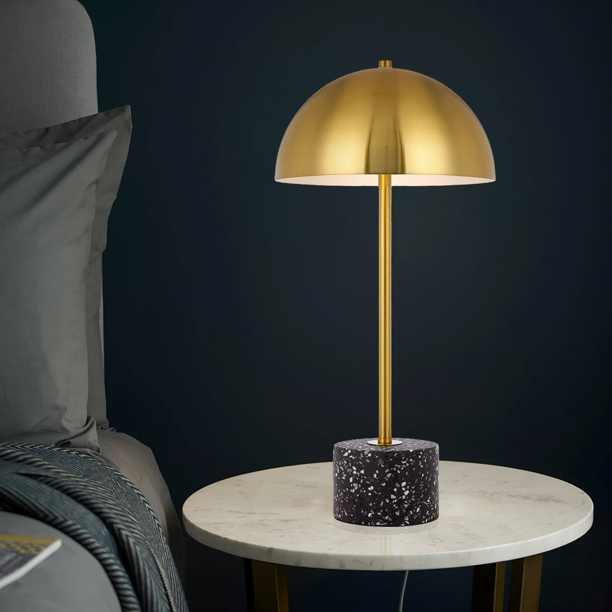 The Domez table lamp is a unique and modern design, sure to make a statement in any room. The domed metal shade gives off an atmospheric mood light, creating a warm and inviting atmosphere. The lamp comes in four colour combinations, including antique bronze with black marble or black terrazzo, and antique gold with black marble or white terrazzo, so you can choose the one that best fits your décor. The latest on-trend metal finishes add sophistication to the lamp. Its luxurious and extravagant design make it a must-have for any stylish home.