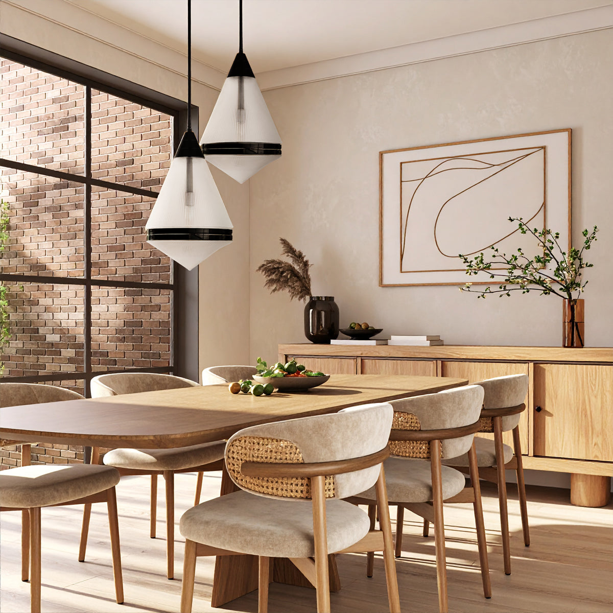 The Harnon Pendant Light blends mid-century modern and art deco influences, featuring a striking conical silhouette with textured glass for a refined, diffused glow. Available in three timeless finishes—antique gold, black, and nickel—this pendant adds elegance to any setting. Use it as a standout feature light or install in a cluster for a bold, statement-making arrangement.