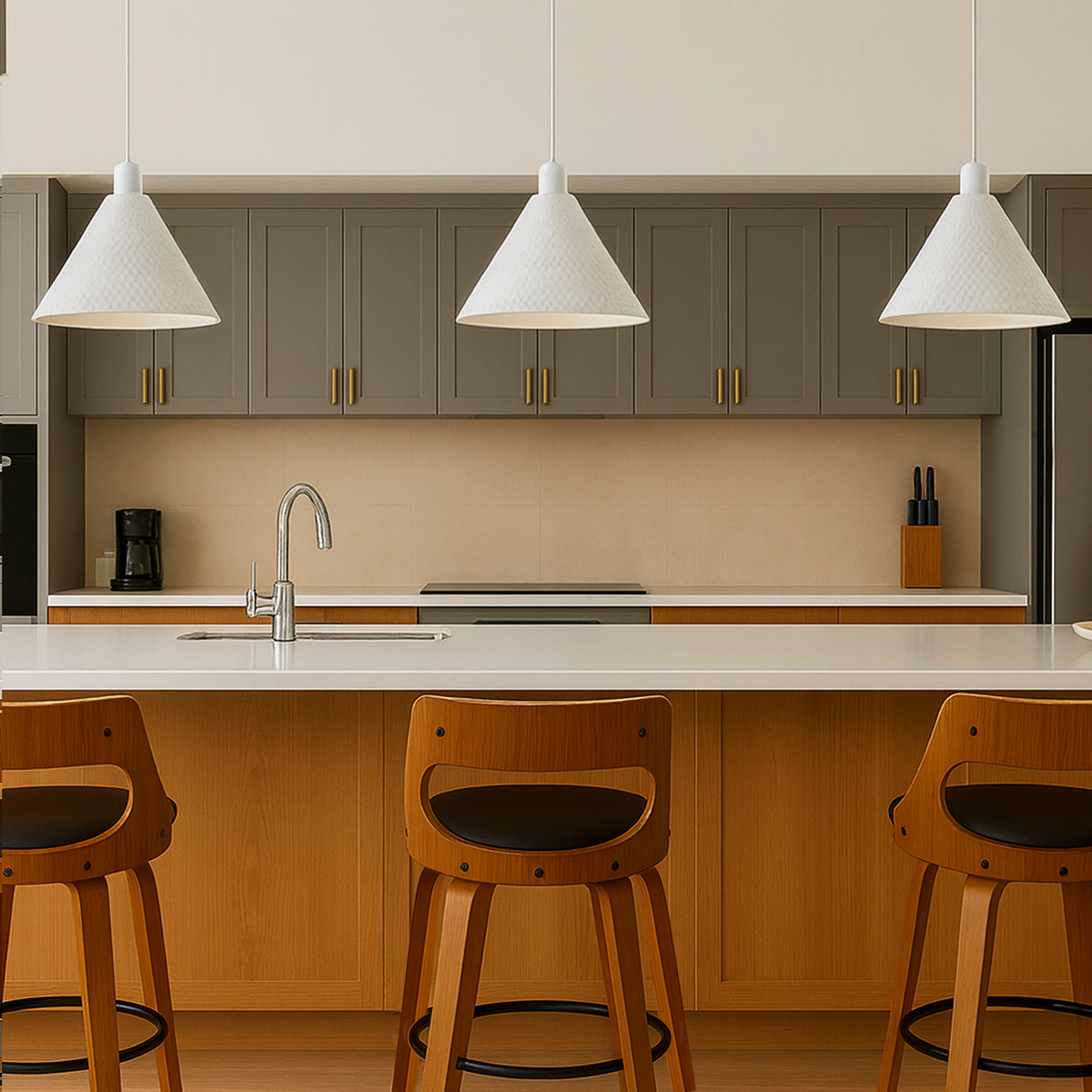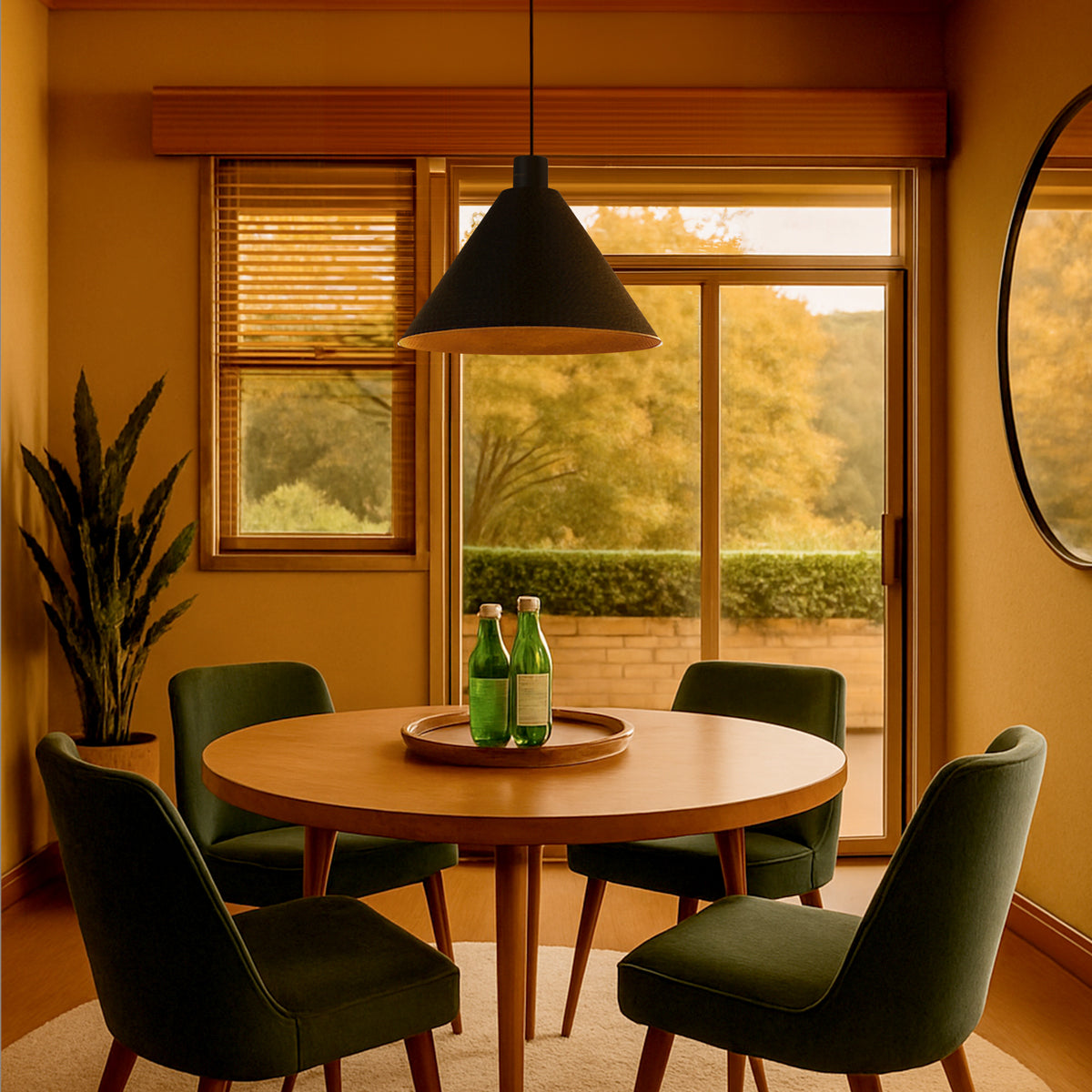 The Kestra pendant features a conical shape with a subtly textured iron surface, adding a sophisticated touch to any room. Its minimalist design and versatile colourways make it suitable for various interior styles. Available in two sizes.