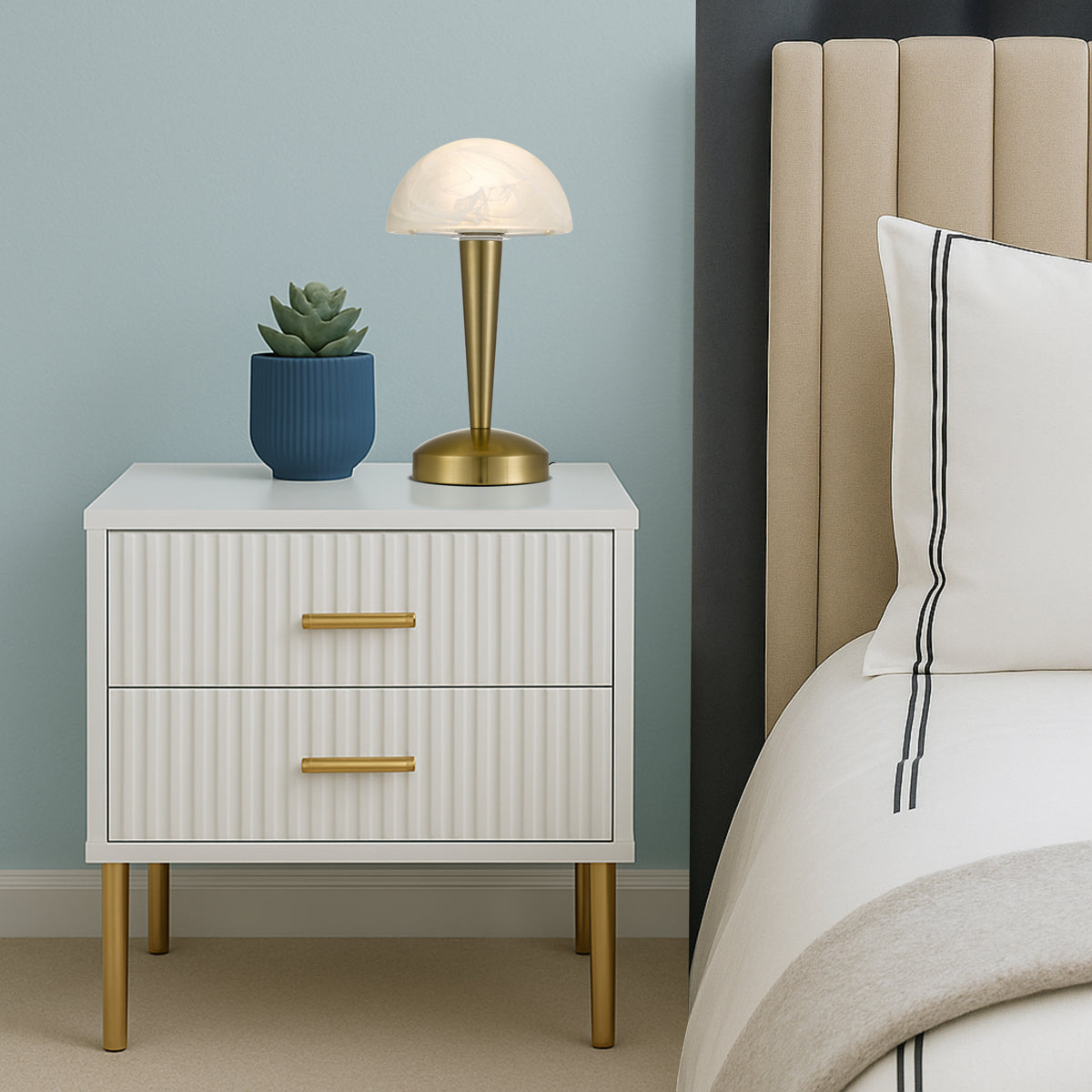 The Mandel Touch Lamp, complete with globe, is a sleek and innovative lighting solution that adds both style and convenience to any space. Crafted from iron and available in a variety of colours, it effortlessly merges contemporary design with practicality.