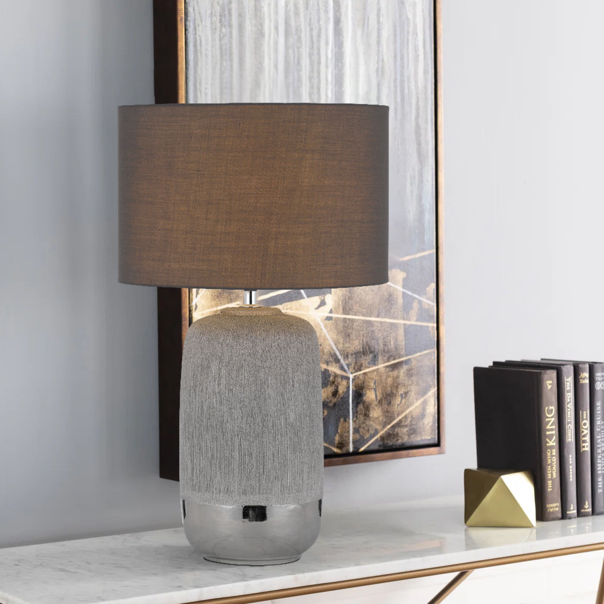 Minimalistic and stately, this grey ceramic accent table lamp with a stone pattern body sitting within a lower chrome cup adds the natural element to a bedroom or living room. Topped in a classic, contrast poly-cotton drum shade.
