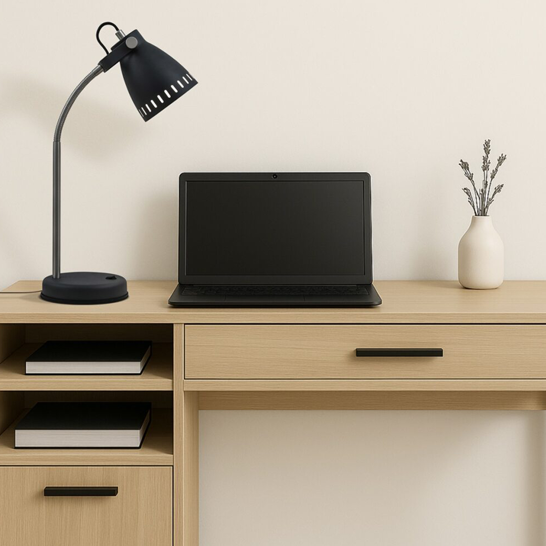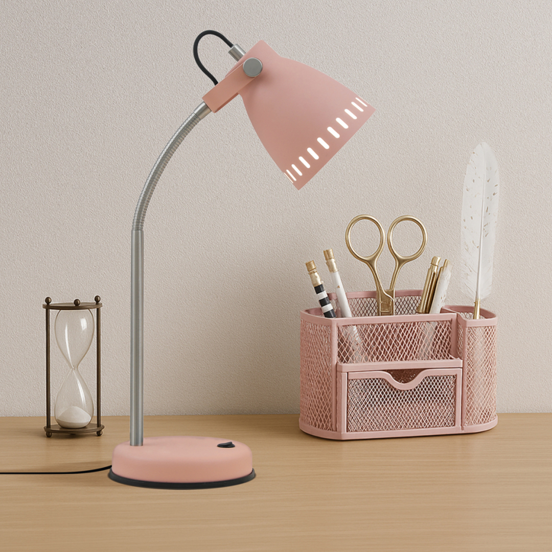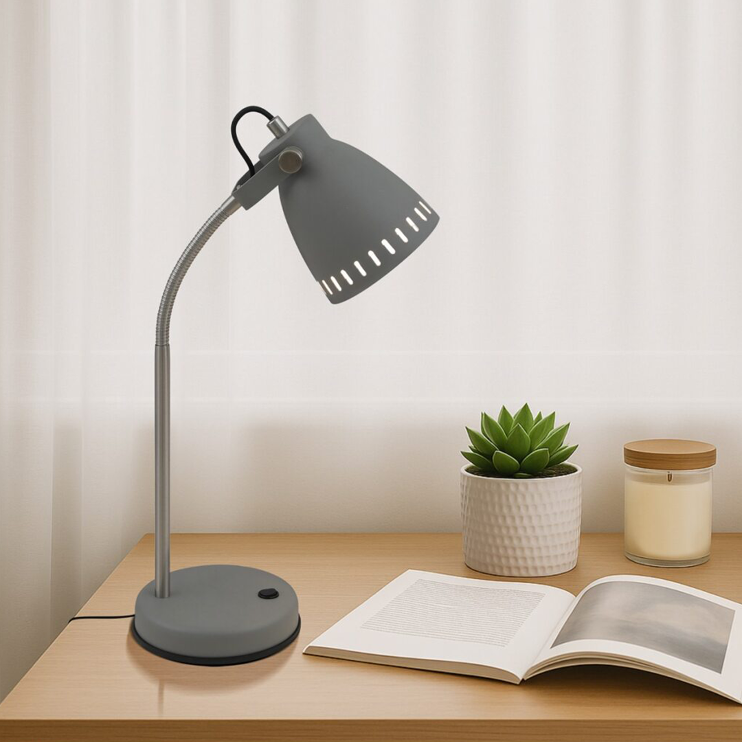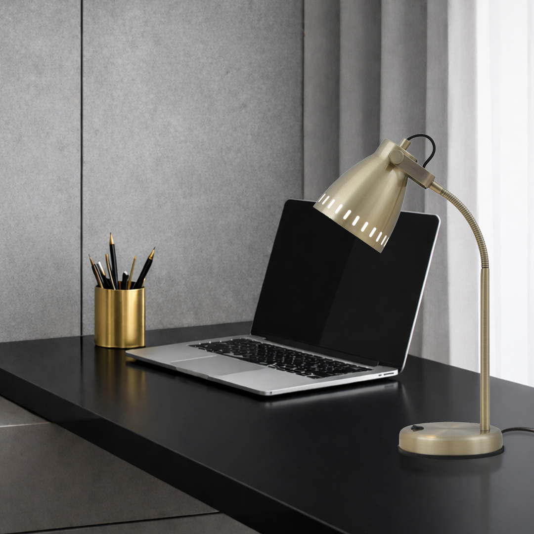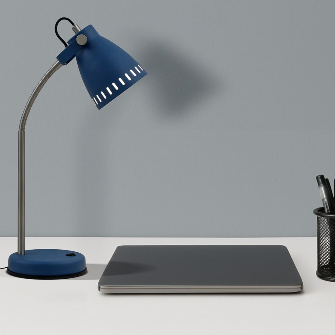 The Nova desk lamp amalgamates the finest elements of contemporary design. Spun metal shade to house a standard A60 globe attached by a saddle deco and a half flexi arm for adjustment. On/off rocker switch located on the lamp base. Also available as floor lamp.