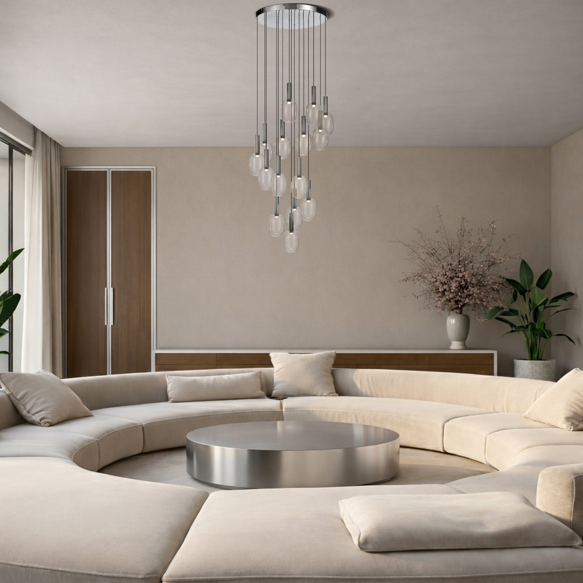 The Obris range features a refined pendant design that blends polished chrome with clear glass for a clean, contemporary look. Available as a minimalist 1 light pendant or a striking 15 light statement piece, Obris brings elegant illumination to indoor spaces. Constructed from iron and glass, each fitting includes integrated LED lighting with a warm 3000K colour temperature, making it ideal for dining areas, stairwells, and living spaces.