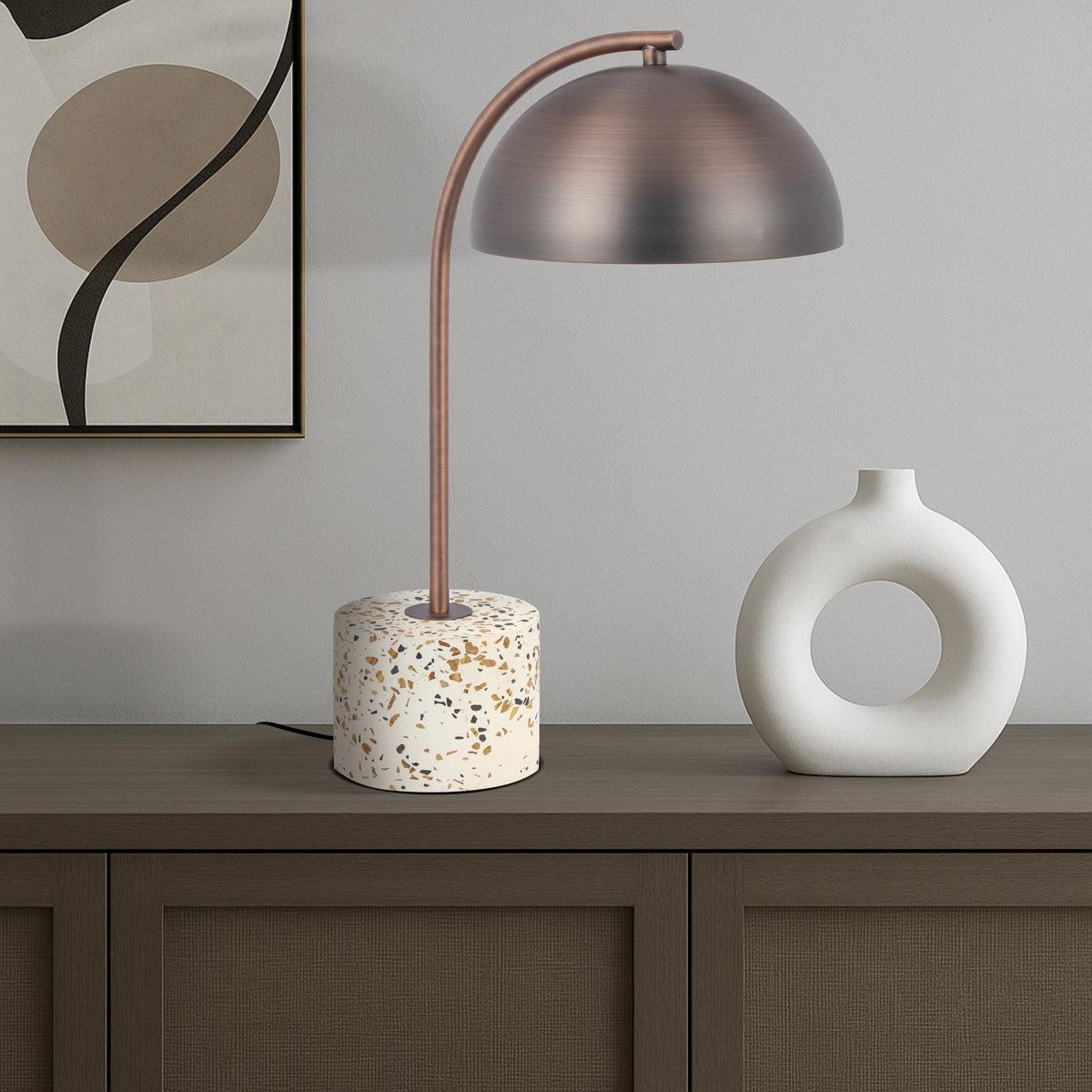 The Ortez Table Lamp is the classic vintage look, supplying lighting to the smaller surfaces of your home. The domed metal shade sits on an arched arm and the terrazzo base offers stability and style to your home's décor. On/off switch located on the lamp's cord.