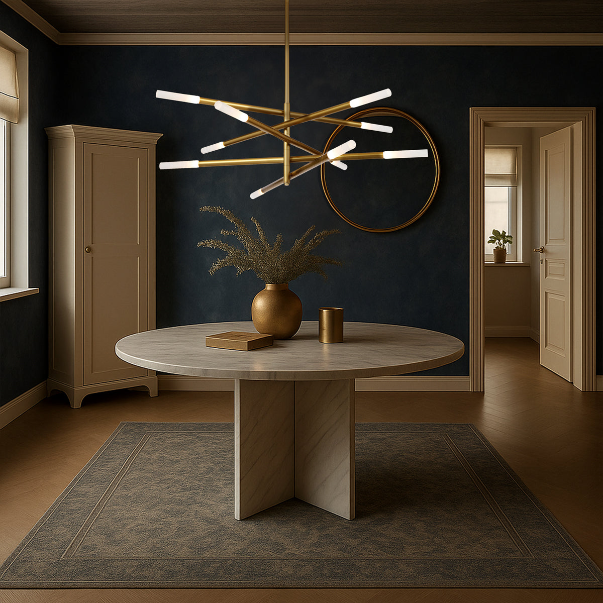 The Pinta Pendant Light is a modern and captivating fixture, available in 8 or 10 light options. Featuring integrated LED rods that emit a warm 3000K color temperature, it is constructed from durable iron and available in both gold and black finishes. Perfect for adding a touch of contemporary elegance to any space.