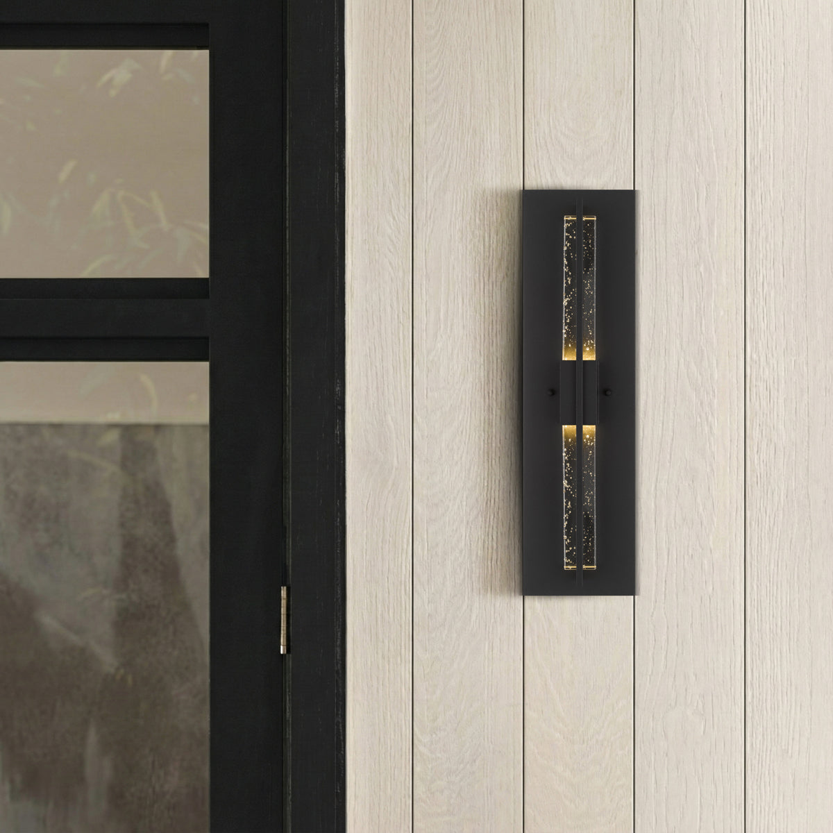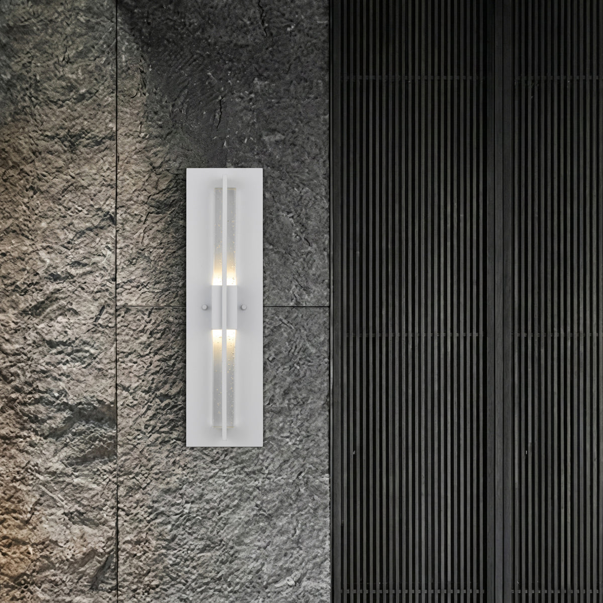 The Prada exterior wall light features a sleek aluminium construction paired with a seeded glass design, adding a touch of elegance and visual interest. Integrated with an LED that emits a warm 3000K light, it creates a modern and inviting ambiance. Available in black or white, the Prada light is a sophisticated choice for enhancing exterior spaces.
