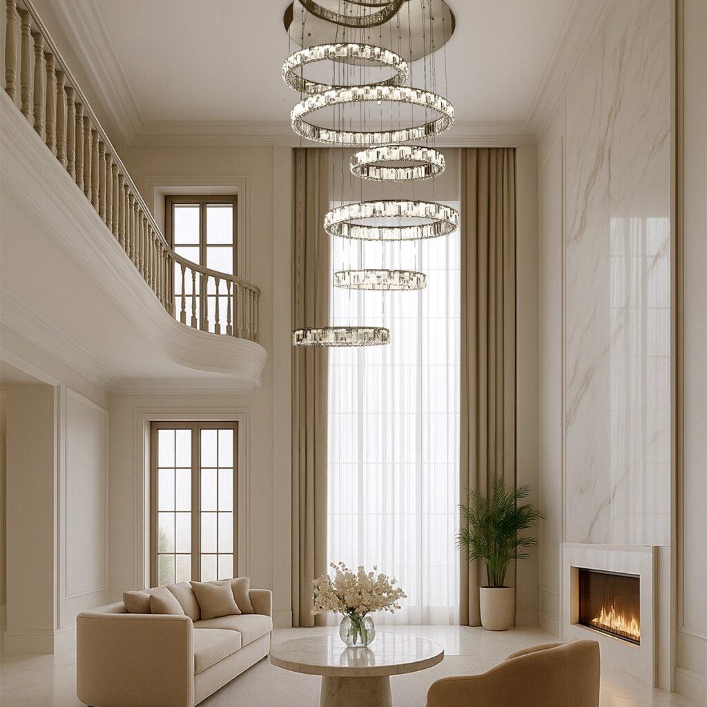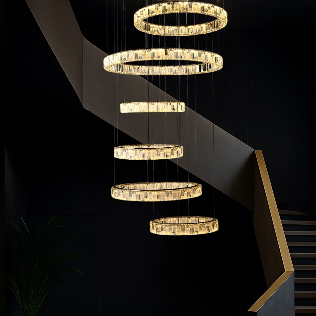The Rias range is an exquisite blend of stainless steel and crystal materials. Available in gold or sleek chrome finishes, the Rias comes in a range of circular sizes in both pendant and close to ceiling fixtures to cater to various spaces and preferences. The integration of advanced LED technology ensures energy efficiency and long-lasting illumination. Adding to their versatility, the fixtures are dimmable by remote, allowing users to adjust the lighting ambiance to suit different moods and occasions.
