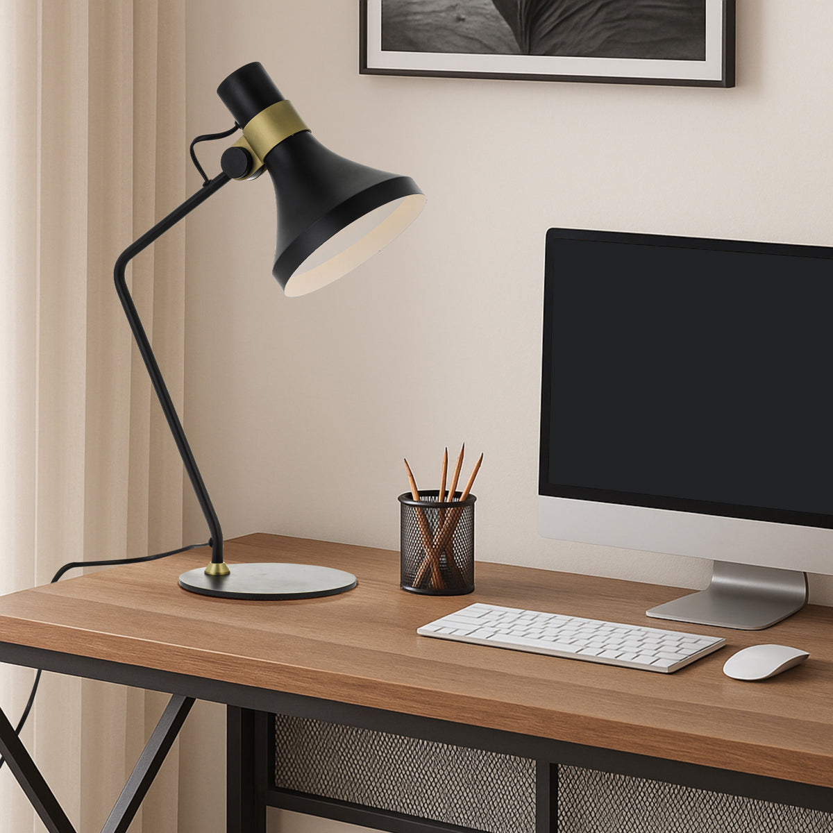 The stylish spun metal shade of the Roma lamp is saddled with a contrasting brass bracket. The angular arm and round base adds an industrial aesthetic and any easy fit for any interior décor. Available as a table or floor lamp.