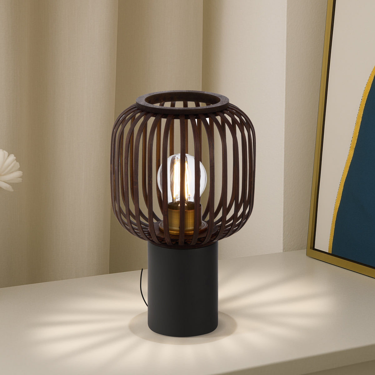 The Sorens table lamp combines an iron base with a bamboo shade, showcasing a contemporary Scandi/Japandi style. Available in two sizes and finished in either a brown or natural shade, it is the perfect accent piece for living room or bedroom spaces, adding warmth and modern elegance.