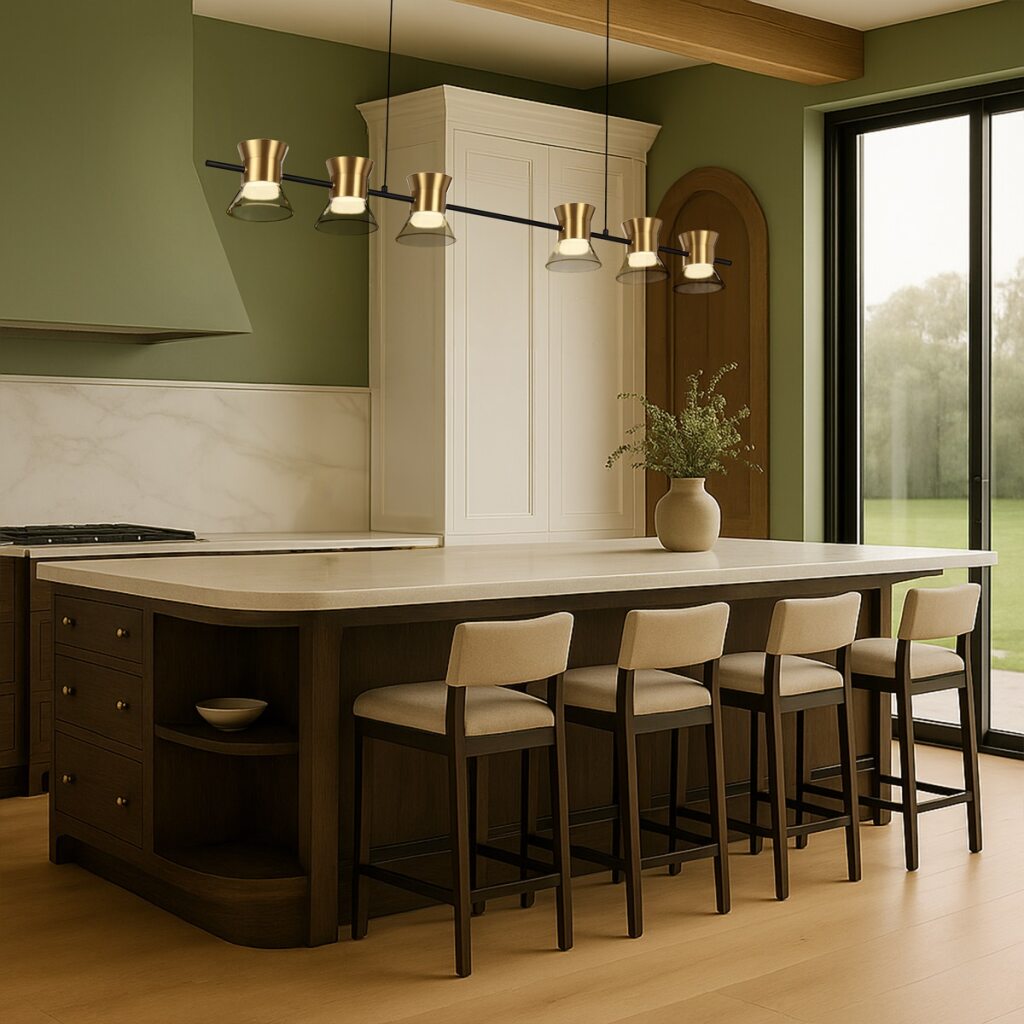 The Tipico range offers elegant 6 or 9 light pendants available in gold or gunmetal finishes. These fixtures feature integrated LEDs that provide a warm 3000K colour temperature, combining sophisticated design with contemporary lighting technology.