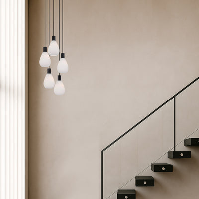The Tresor family is a modern teardrop pendant suitable for today's modernist décor. The simple mouth-blown glass provides a subtle atmospheric light. The glass is offered in opal matt, the metalware is a rich satin black, while the pendants are suspended with textile cable.