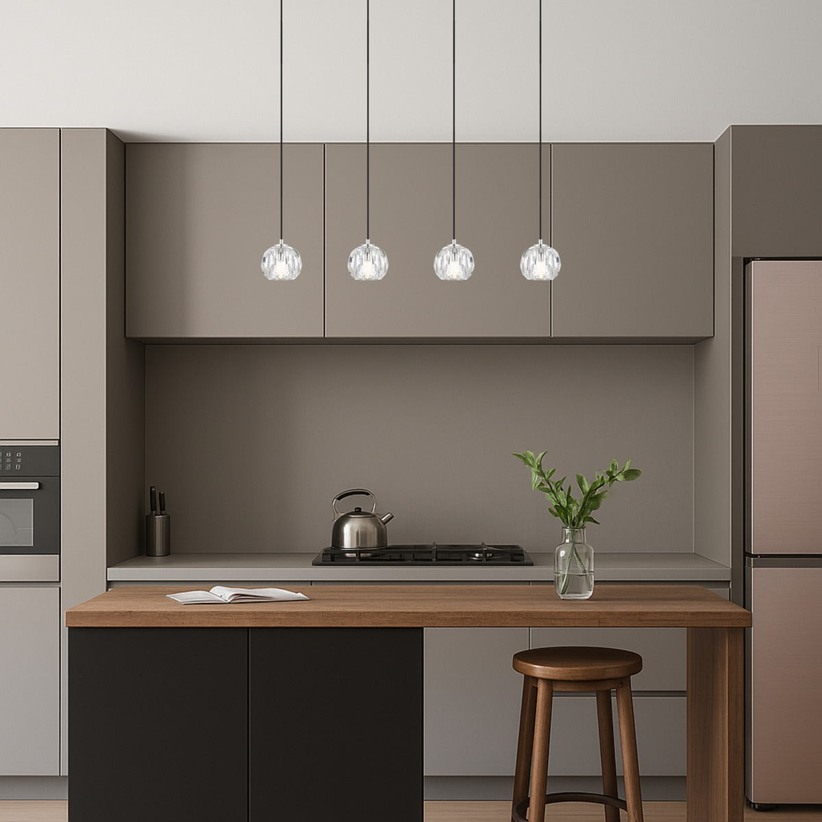 Spheres of prismatic cut crystal bring contemporary glamour to the Zaha collection. Each sphere is illuminated with a LED twinkle globe accentuating the cut surface. The family includes a 1 light pendant, 1 light wall lamp, 2 light table lamp, 4 light bar pendant, 5 light round pendant and 10 light round pendant. Available in Antique gold or chrome.